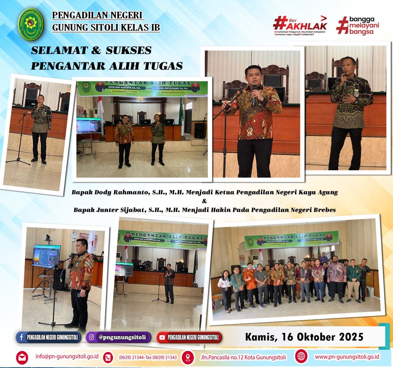 Gunungsitoli, Kamis (16/10/2025) — Pengadilan Negeri Gunung Sitoli menggelar acara Pengantar Alih Tugas Hakim yang berlangsung di ruang Sidang Pengadilan Negeri Guungsitoli. Acara ini digelar sebagai bentuk penghormatan dan apresiasi kepada Wakil Ketua dan Hakim yang akan melaksanakan tugas di satuan kerja baru.