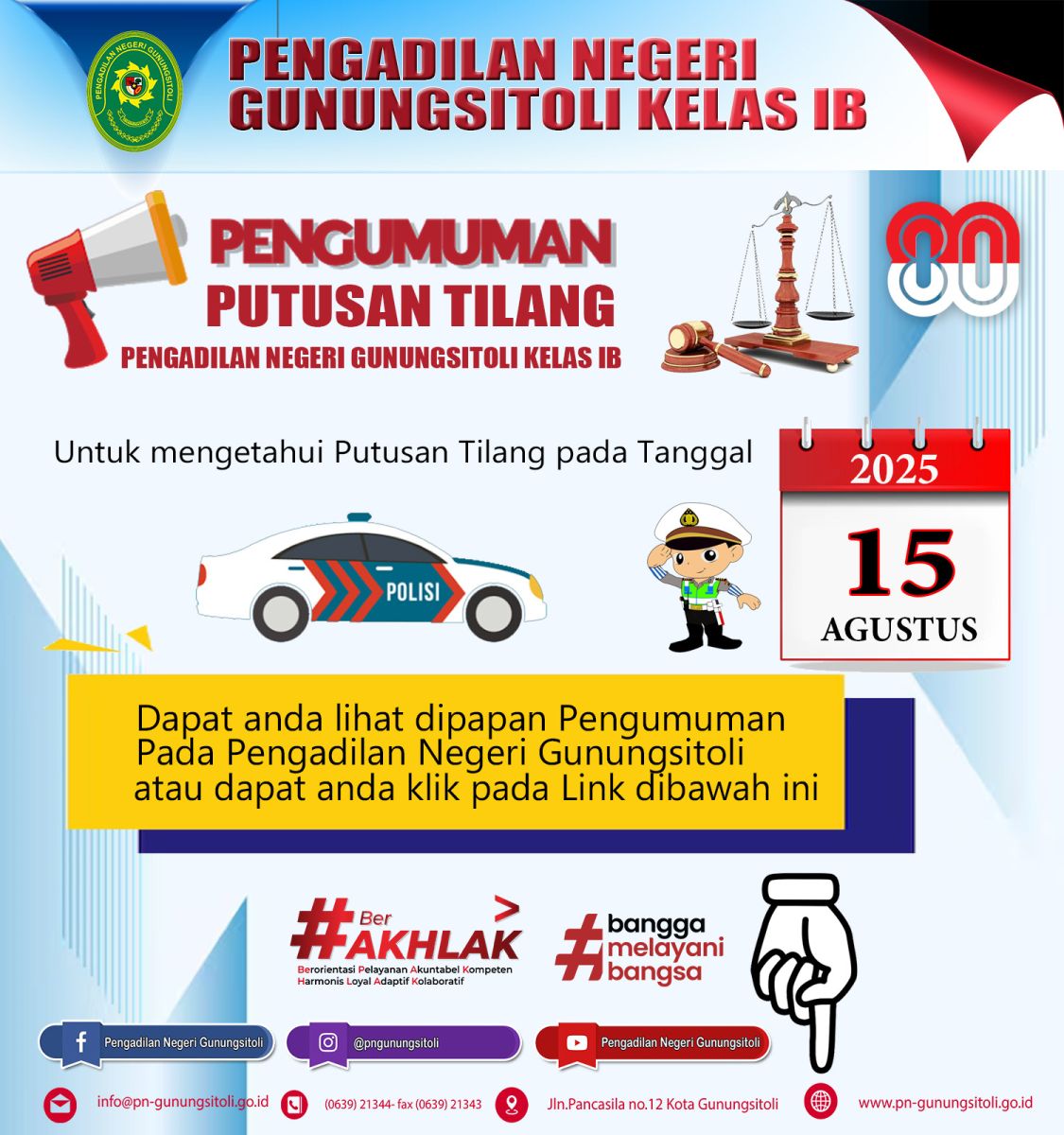 Untuk mengetahui pengumuman tilang tanggal 15 Agustus 2025 dapat anda lihat di papan pengumuman Pengadilan Negeri Gunungsitoli atau dapat anda klik pada link dibawah ini.