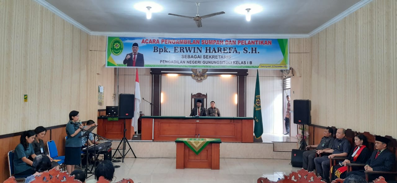 Jumat, 02 September 2022. Bertempat di Ruang Sidang Cakra, Keluarga Besar Pengadilan Negeri Gunungsitoli melaksanakan Acara Pelantikan Bapak Erwin Harefa, S.H sebagai Sekretaris Pengadilan Negeri Gunungsitoli. Acara Pelantikan di ikuti oleh seluruh Aparatur Pengadilan Negeri Gunungsitoli dan dipimpin oleh Ketua Pengadilan Negeri Gunungsitoli.