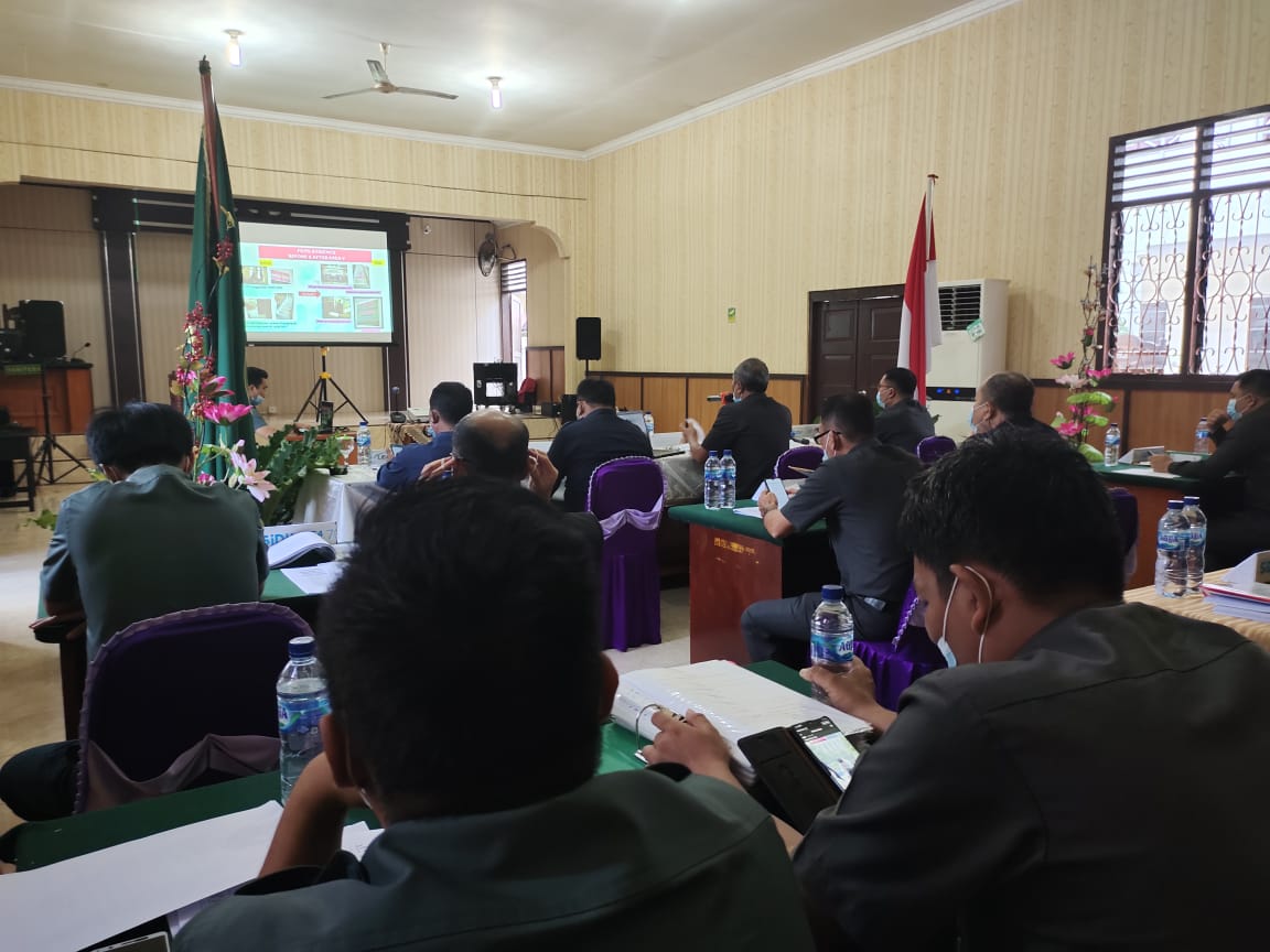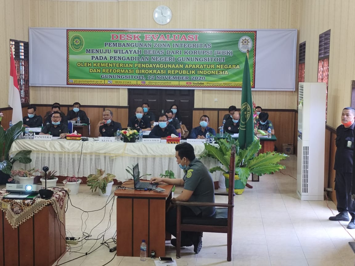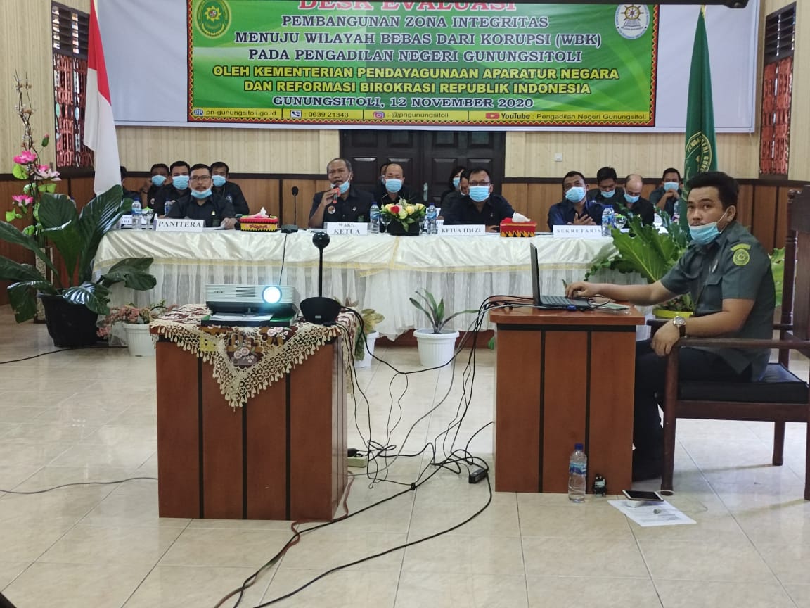Humas, 13 November 2020. Pengadilan Negeri Gunungsitoli sebagai salah satu satuan kerja yang mengikuti pembangunan zona integritas menuju wilayah bebas korupsi (wbk) dan wilayah birokrasi bersih melayani (wbbm) di wilayah Pengadilan Tinggi Medan hari ini mengikuti kegiatan desk evaluasi pembangunan zona integritas oleh tim penilai dari Kemenpan Reformasi Birokrasi. Bertempat di ruang sidang cakra, pada pukul 15.45 kegiatan tersebut dimulai. Desk evaluasi dilakukan dengan menggunakan media teleconference zoom, dan Wakil Ketua Pengadilan Negeri Gunungsitoli, Bapak Agus Komarudin, S.H hadir sebagai pimpinan kegiatan didampingi Ketua Tim Zona Integritas, Bapak Taufiq Noor Hayat, S.H dan Juga Panitera, Bapak Armada Sembiring, S.H serta Sekretaris, Bapak Elixsander Saragih, S.H. Tak lupa hadir masing-masing koordinator area zona integritas Pengadilan Negeri Gunungsitoli, ada 6 area dan diikuti juga operator masing-masing area. Kegiatan berlangsung dengan tetap mematuhi protokol kesehatan.