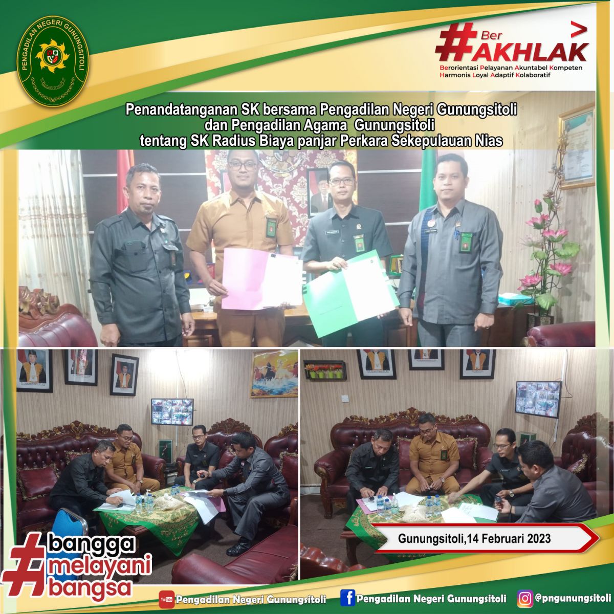 Selasa, 14 Februari 2023 Pengadilan Negeri Gunungsitoli dan Pengadilan Agama Gunungsitoli melaksanakan penandatanganan MoU Surat Keputusan Radius Bersama Tahun 2023. Acara dilaksanakan di Ruang kerja Ketua Pengadilan Negeri Gunungsitoli, Bapak Wijawiyata S.H., yang hanya di hadiri oleh Ketua Pengadilan Agama Gunung Sitoli (Panji Nugraha Ruhiat, S.H.I., M.H.) didampingi Panitera Pengadilan Negeri Gunung Sitoli, Bapak Daniel Kemit, S.H., serta Ketua Pengadilan Agama Gunungsitoli yang juga didampingi oleh Panitera Pengadilan Agama Gunungsitoli.