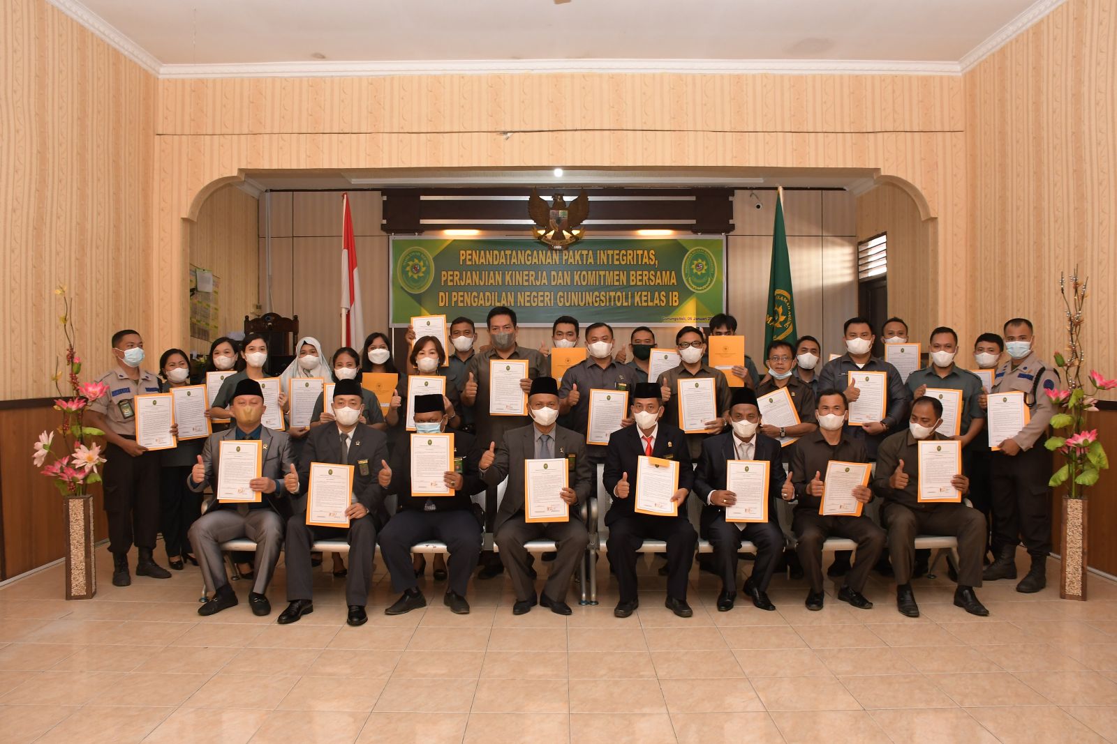 Humas, 06 Januari 2022. Bertempat di Ruang Sidang Cakra Pengadilan Negeri Gunungsitoli, telah dilaksanakan Penandatanganan Pakta Integritas, Perjanjian Kinerja dan Komitmen Bersama sebagai rangkaian kegiatan rutin awal tahun. Acara ini dipimpin langsung oleh Ketua Pengadilan Negeri Gunungsitoli, Bapak Agus Komarudin, S.H dan diikuti oleh Seluruh Hakim, Pejabat Struktural & Fungsional, Staff dan Tenaga PPNPN. Kegiatan Penandatanganan Pakta Integritas merupakan acara sakral bagi seluruh abdi negara dalam menjalankan tugasnya sebagai pelayan masyarakat, demikian dengan Penandatanganan Perjanjian Kinerja, sebagaimana yang telah diatur bahwa seluruh ASN memiliki target kinerja yang terukur sehingga dibutuhkan komitmen dalam mencapai dan memnuhi target yang telah ditentukan.
