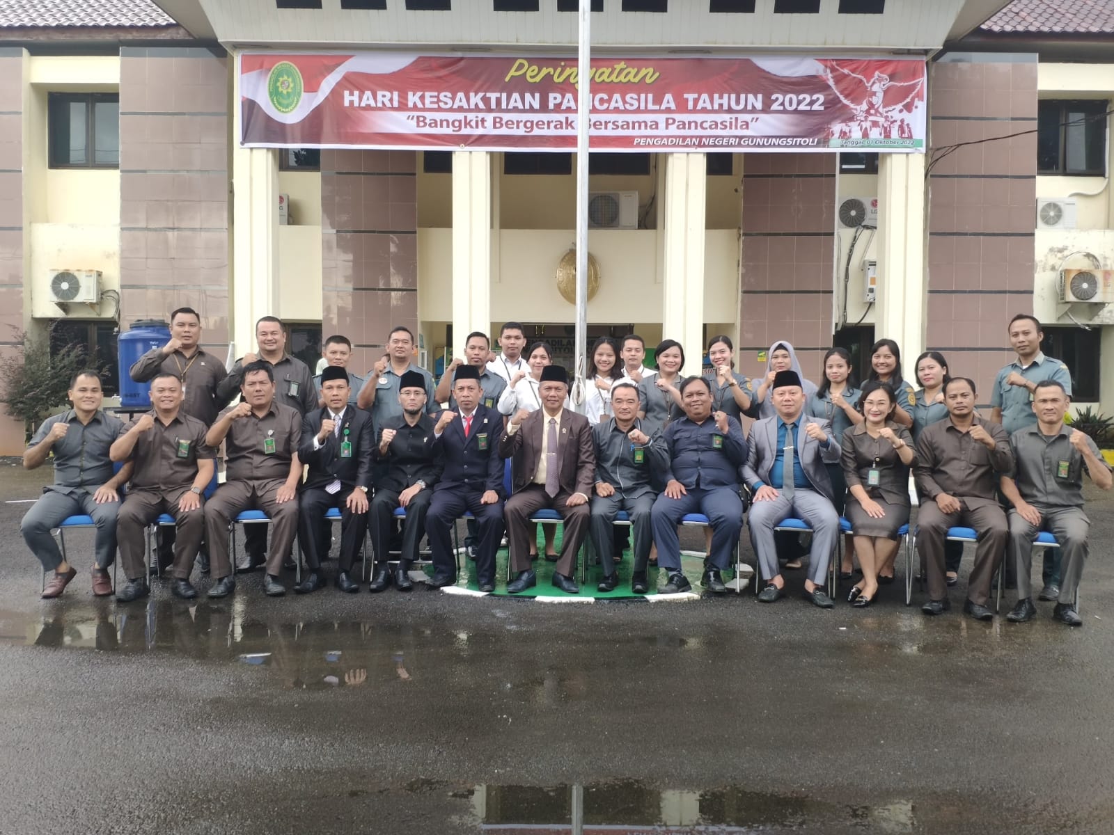 Humas, 01 Oktober 2022. Tepat pada pukul 08.00 WIB dilaksanakan kegiatan peringatan hari keaktian pancasila 01 Oktober 2022 di Lapangan Upacara Pengadilan Negeri Gunungsitoli. Peserta upacara dihadiri oleh seluruh pegawai Pengadilan Negeri Gunungsitoli dan Dharmayukti Karini Cab. Gunungsitoli. Hadir selaku pembina upacara ialah Ketua Pengadilan Negeri Gunungsitoli, Agus Komarudin, SH dan Inspektur Upacara Bapak Ikuti Telaumbanua, SH.