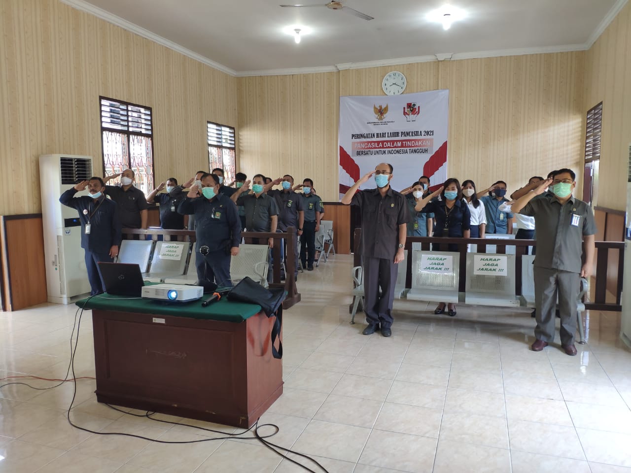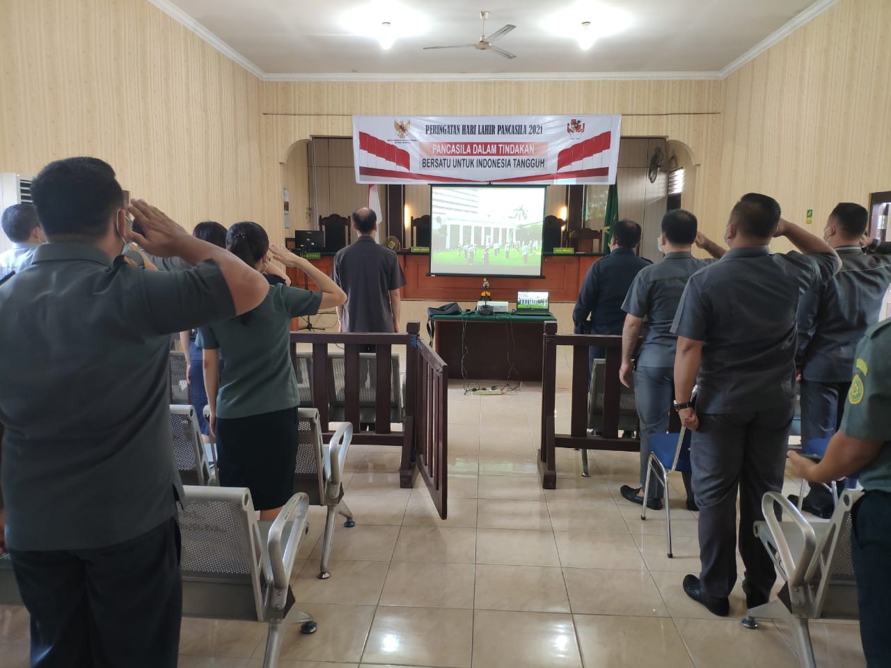 Humas, 01 Juni 2021. Bertempat di Kantor Pengadilan Negeri Gunungsitoli, seluruh aparatur menghadiri kegiatan peringatan Hari Lahir Pancasila yang dilaksanakan secara virtual di Istana Presiden Republik Indonesia. Upacara berlangsung tepat pada pukul 08.00, dan di pimpin langsung oleh Bapak Ir. Joko Widodo, Presiden Republik Indonesia. Sementara itu kegiatan nonton bareng virtual di Pengadilan Negeri Gunungsitoli dihadiri oleh seluruh pimpinan tanpa terkecuali, mulai dari seluruh honorer, CPNS, Pejabat fungsional, Hakim, Sekretaris, Panitera dan Wakil Ketua Pengadilan Negeri Gunungsitoli. Adapun tema peringatan Hari Lahir Pancasila tahun ini ialah "Pancasila dalam tindakan, Bersatu untuk indonesia tangguh".
