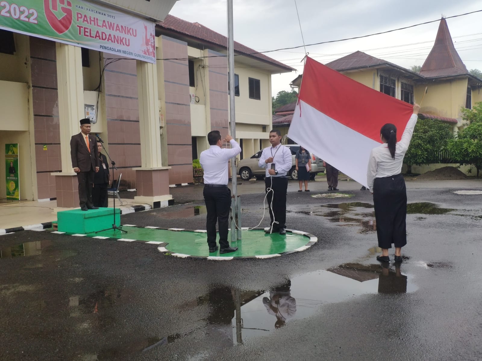 Humas, 10 November 2022. Bertempat dilapangan Pengadilan Negeri Gunungsitoli, telah dilaksanakan Peringatan Upacara Hari Pahwlan 10 November 2022. Rangkaian acara terlaksana dengan baik walaupun sebelumnya ada hujan yang menyelimuti kota gunungsitoli. Hadir selaku Pembina Upacara Ketua Pengadilan Negeri Gunungsitoli Bapak Agus Komarudin, SH dan sebagai Inspektur Upacara ialah Bapak Ikuti Telaumbanua, SH. Seluruh pegawai baik Hakim, Pejabat Struktural/Fungsional, Pelaksana dan PPNPN menghadiri upacara tersebut. Tema upacara peringatan hari pahlawan pada tahun ini ialah, "Pahlawanku Inspirasiku".