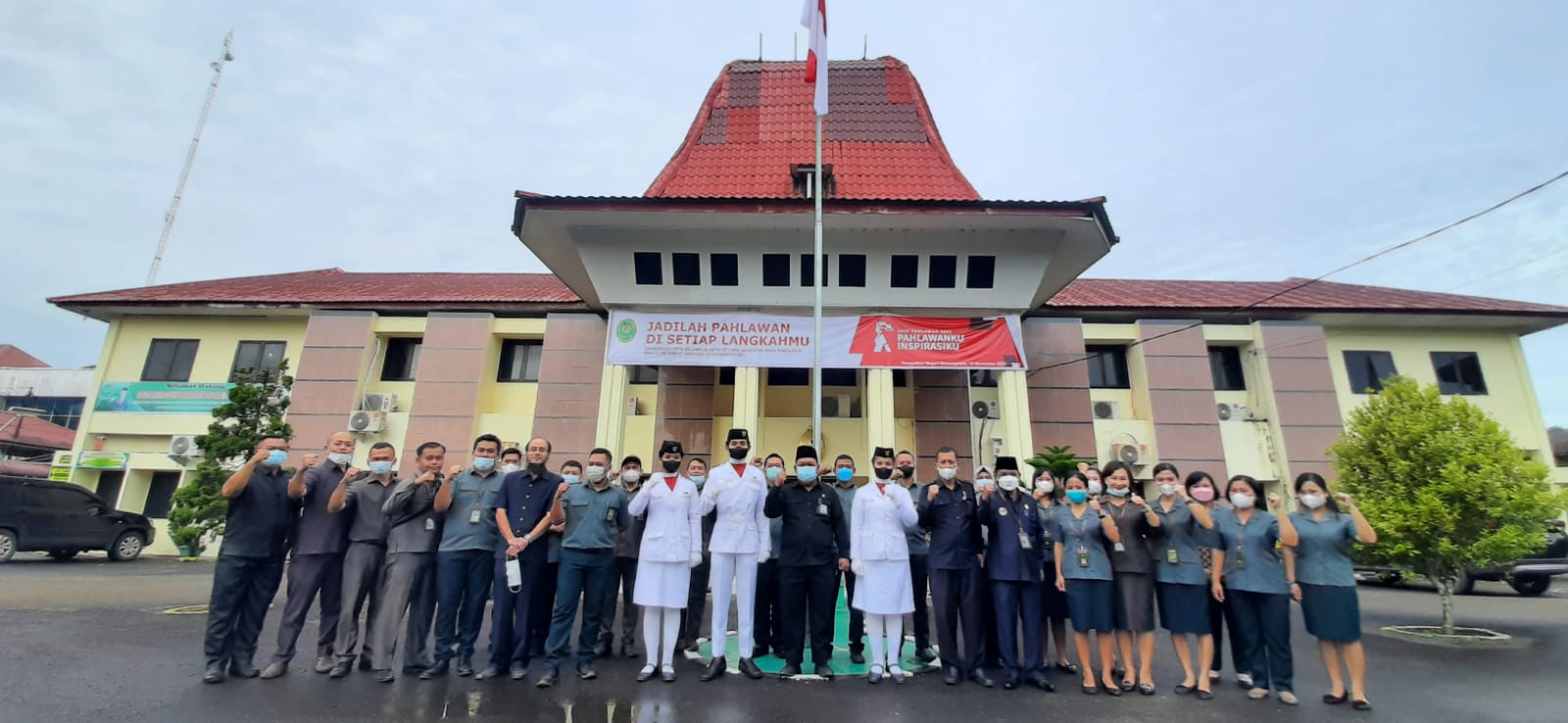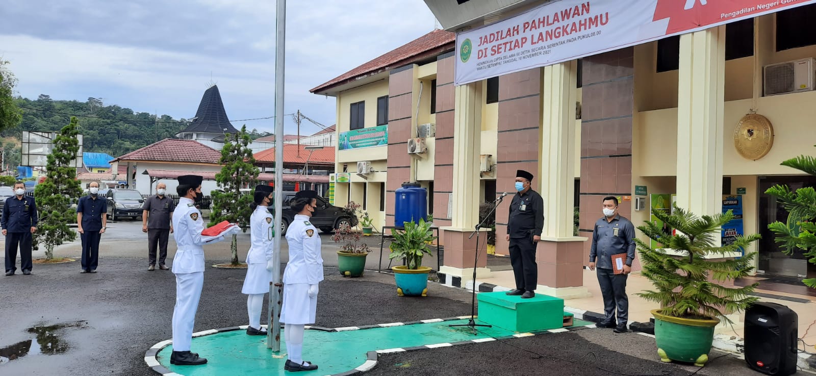 Humas, 10 November 2021. Bertempat di Lapangan Kantor Pengadilan Negeri Gunungsitoli, Seluruh Aparatur, Pejabat Struktural dan Fungsional berkumpul dalam rangka memperingati Hari Pahlawan pada tanggal 10 November 2021. Hadir sebagai pembina upacara, ialah Ketua Pengadilan Negeri Gunungsitoli, Bapak Agus Komarudin, S.H, sementara Inspektur Upacara ialah Bapak Ikuti Telaumbanua, S.H. Hari Pahlawan tahun ini bertemakan "Pahlawan Ku Inspirasi Ku". Kondisi cuaca sedikit hujan, namun tetap tidak menyurutkan seluruh aparatur untuk melangsungkan upacara penghormatan kepada Pahlawan yang telah berjasa bagi Negara Kesatuan Republik Indonesia.