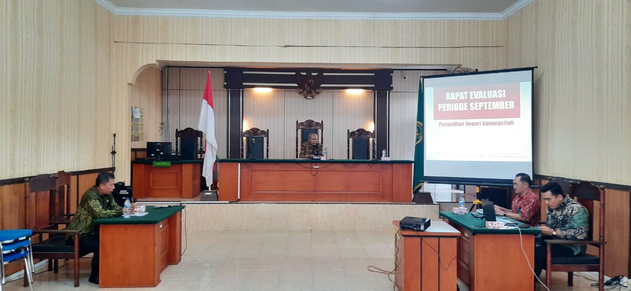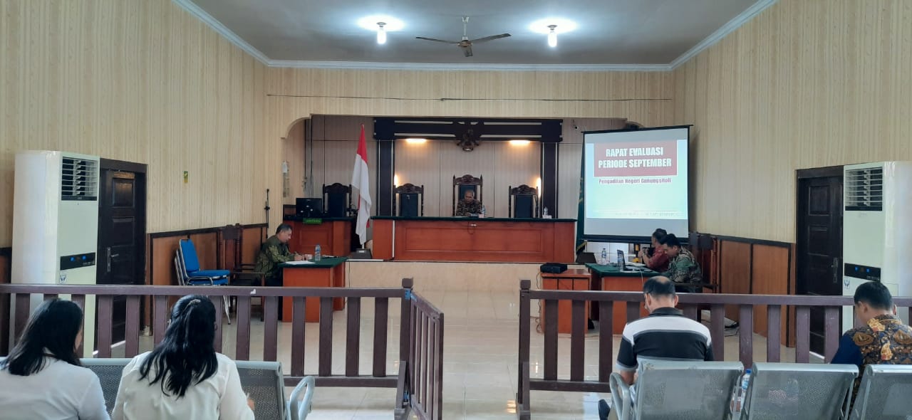 Humas, 30 September 2022. Pengadilan Negeri Gunungsitoli pada hari ini melaksanakan rapat evaluasi periode september 2022 bersamaan dengan sosialisasi pemaparan Dirjen Badilum kepada seluruh ASN. Rapat dipimpin oleh Ketua Pengadilan Negeri Gunungsitoli, Bapak Agus Komarudin, S.H dan dihadiri oleh seluruh Pejabat dan Pegawai PN Gunungsitoli.