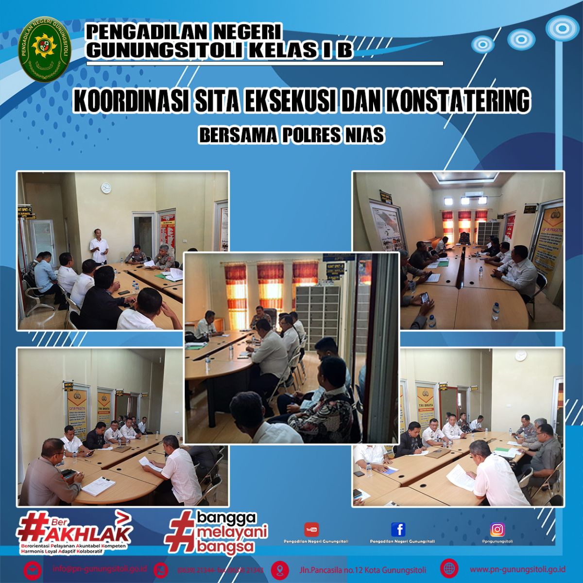 Rabu,3 Mei 2023, bertempat di ruang Monitoring Center Polres Nias, dilaksanakan koordinasi Pengadilan Negeri Gunungsitoli yg diwakili oleh Panitera dan Panitera Muda Perdata dg Pihak Keamanan Polres Nias utk pelaksanaan Sita Eksekusi dan Konstatering perkara no.56/Pdt.G/2021/PN Gst antara Kalapas Kelas II b Gusit sbg pemohon Eksekusi lawan Nurasti Tobing,dkk sbg Termohon Eksekusi.