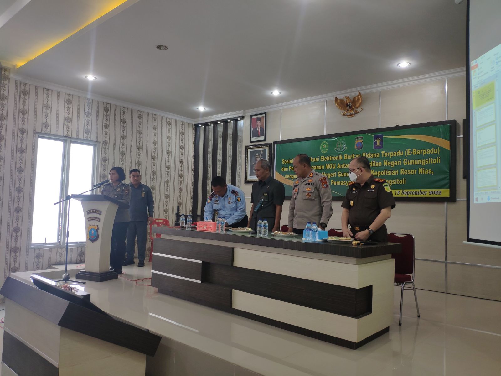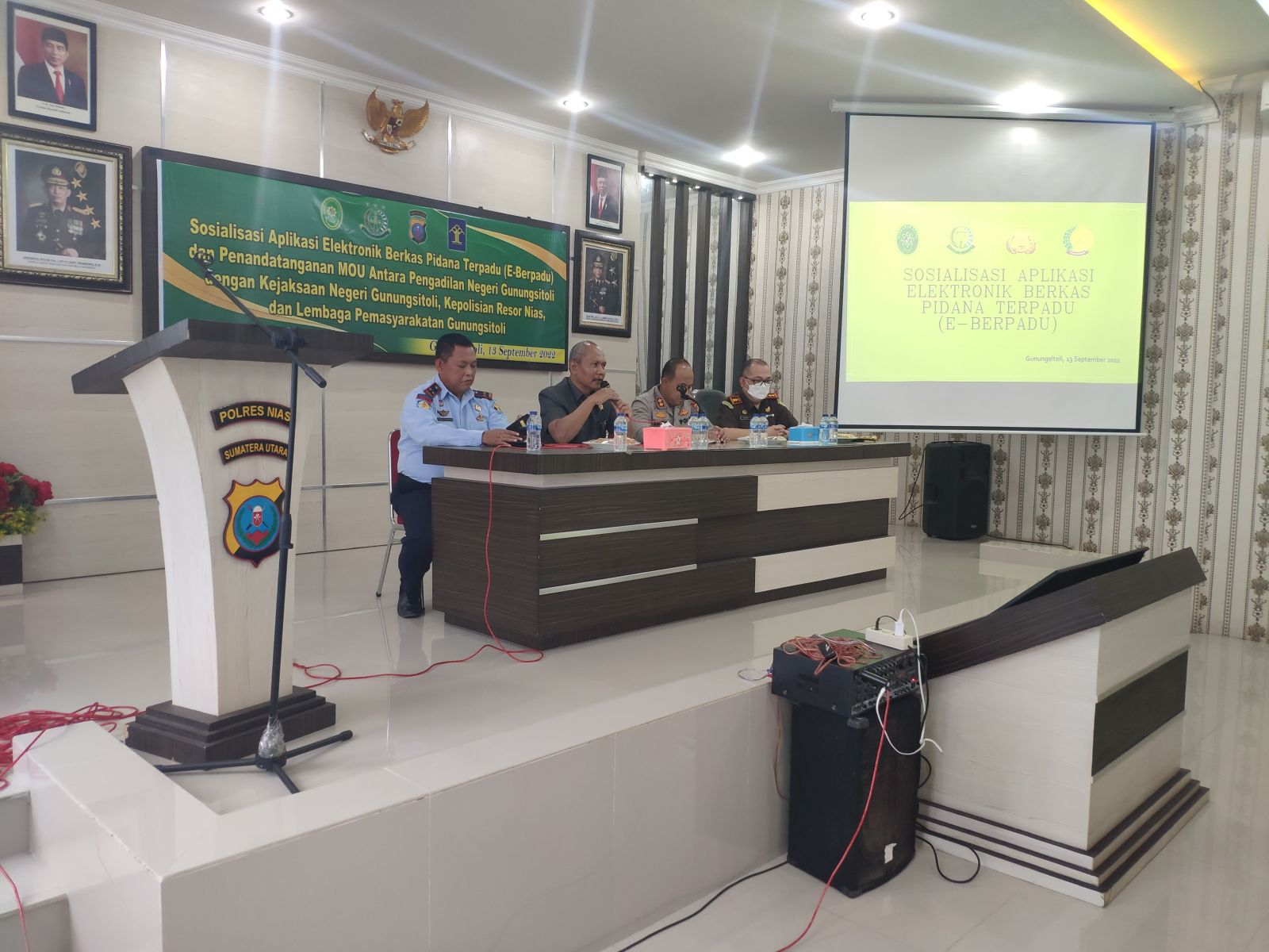 Humas, 13 September 2022. Bertempat di aula Polres Nias dilaksanakan kegiatan lanjutan Sosialisasi E-Berpadu untuk para Penyidik, Penuntut Umum dan Petugas Lapas di Kota Gunungsitoli dan Sekitarnya. Hadir dalam acara selaku Pimpinan Acara ialah, KPN Gunungsitoli, Bapak Kapolres Nias, Bapak Kajari Gunungsitoli dan Bapak Kalapas Kota Gunungsitoli. Turut hadir para penyidik, penuntut umum dan operator lapas dari masing-masing instansi.