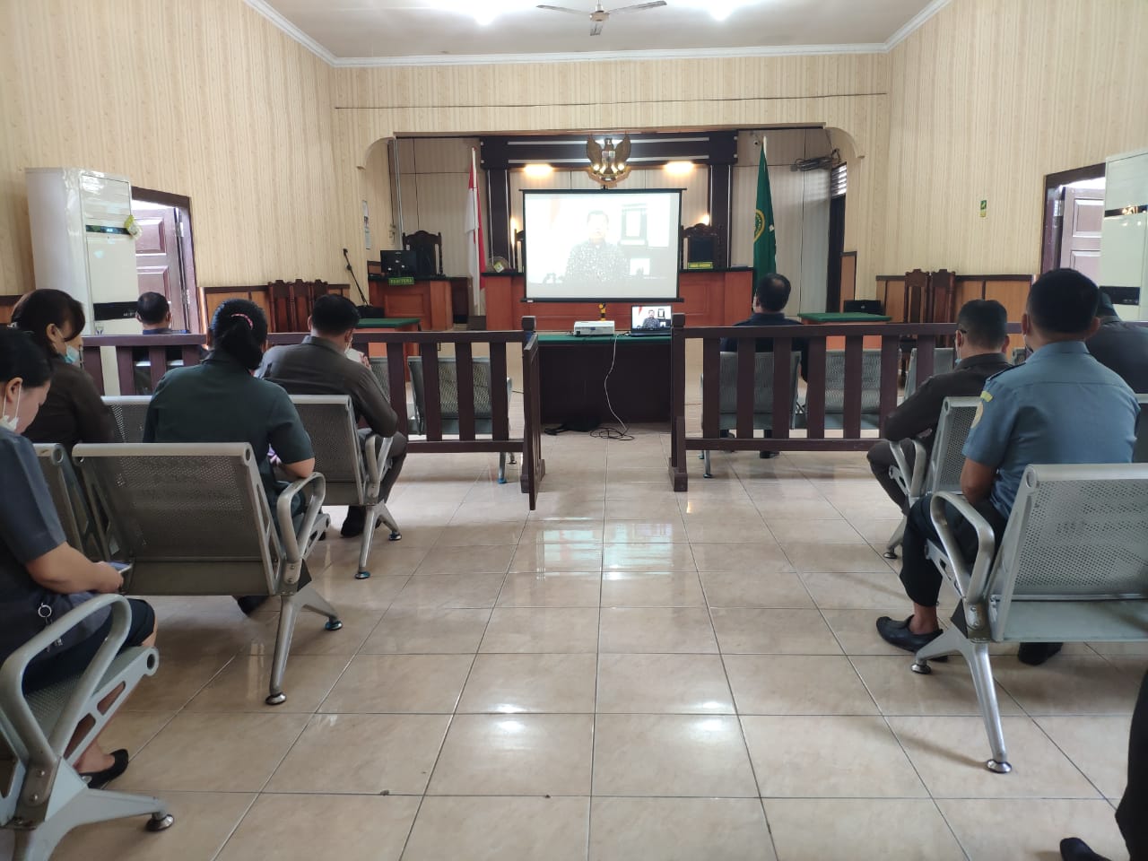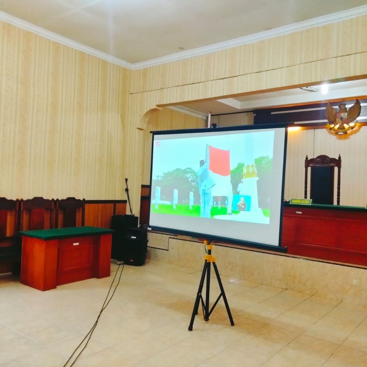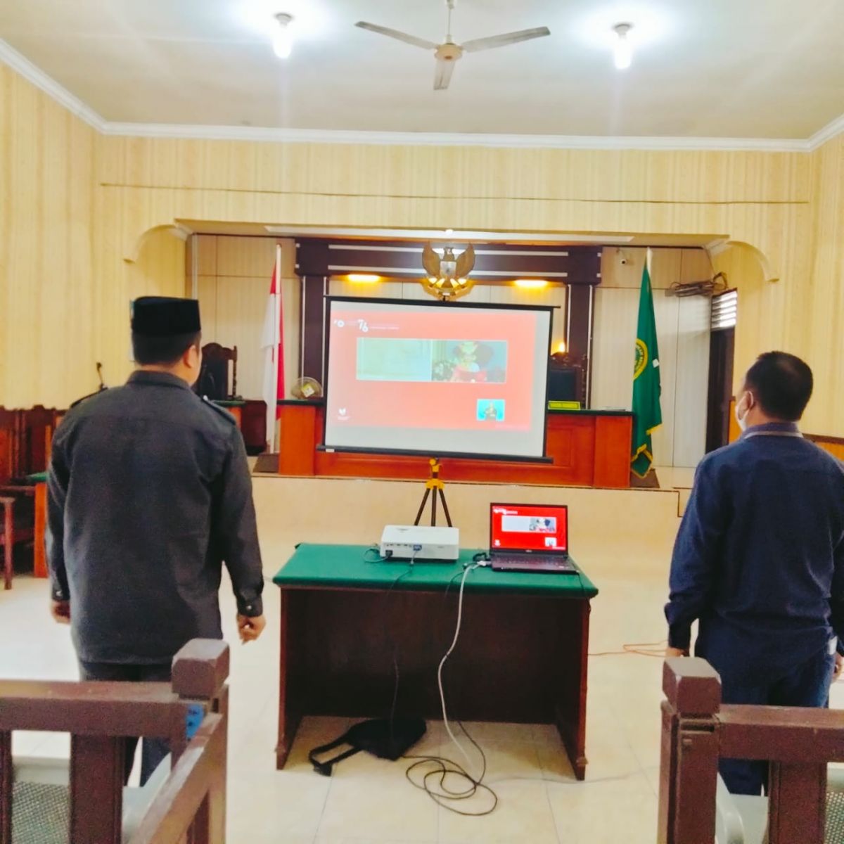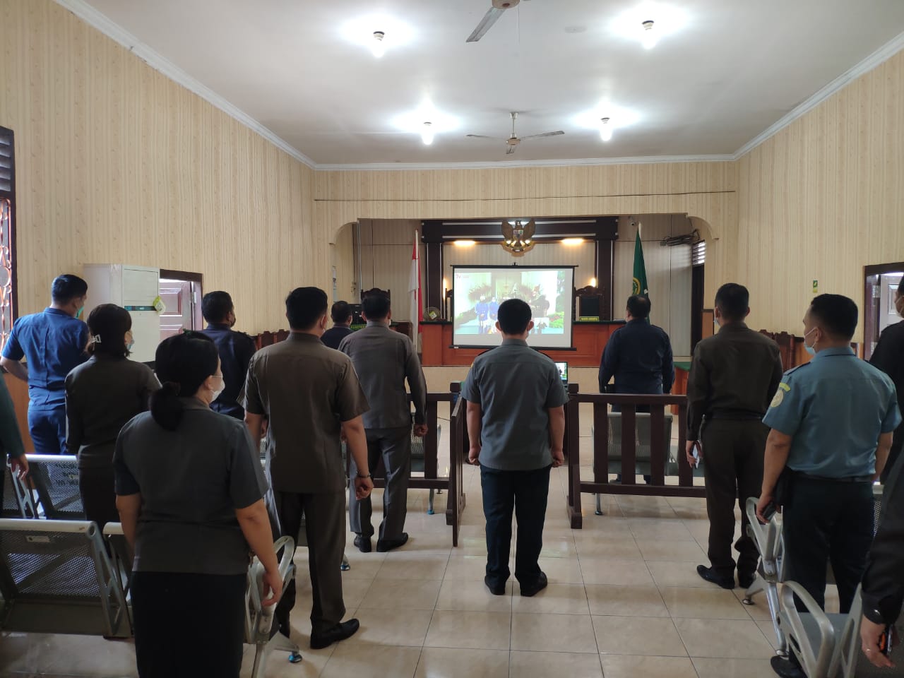 Aparatur Pengadilan Negeri Gunungsitoli selaku Abdi Negara tidak lupa menunaikan kewajibannya untuk hadir dan mengikuti seluruh prosesi Upacara Pengibaran Sang Bendera Merah Putih, meskipun secara Virtual. Seluruh aparatur, tepat hadir pada pukul 09.00 WIB di Ruang Sidang Cakra Pengadilan Negeri Gunungsitoli. Pelaksanaan Upacara Virtual yang dilaksanakan ini pun tetap mengedepankan Protokol Kesehatan yang berlaku. Seluruh aparatur yang masuk ke ruangan wajib menggunakan masker dan mecuci tangan sebelum masuk ke ruangan serta berada pada posisi yang telah disediakan dengan mengacu kepada aturan jarak aman penyebaran virus covid-19 yaitu 1 (satu) meter. Tepat pukul 09.00 WIB, rangkaian Upacara Pengibaran Bendera di Istana Negara dimulai, Opening Upacara dimulai dengan teaser film dan diikuti dengan hiburan yang bertemakan kemerdekaan lainnya. Setelah rangkaian opening, acara inti berlangsung pada Pukul 10.00 WIB, seluruh aparatur Pengadilan Negeri Gunungsitoli berada pada posisi siap melaksanakan upacara.