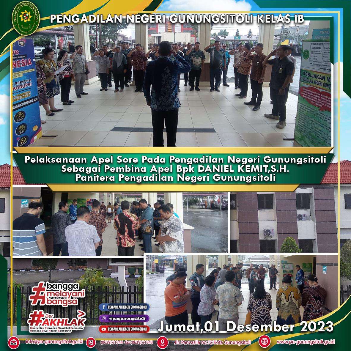 Humas, 01 Desember 2023. Pengadilan Negeri Gunungsitoli melaksanakan Apel Jumat Sore pada tanggal 01 Desember 2023. Apel dipimpin oleh Panitera Pengadilan Negeri Gunungsitoli, Bapak Daniel Kemit, S.H. M.H., dan dihadiri oleh seluruh pegawai Pengadilan Negeri Gunungsitoli.
