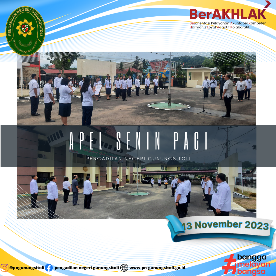 Humas, 13 November 2023. Pengadilan Negeri Gunungsitoli melaksanakan Apel Senin Pagi pada tanggal 13 November 2023. Apel dipimpin oleh Hakim Pengadilan Negeri Gunungsitoli, Bapak Achmadsyah Ade Mury, S.H. M.H., dan dihadiri oleh seluruh pegawai Pengadilan Negeri Gunungsitoli.