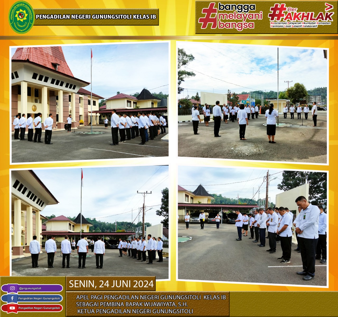 Humas, 24 Juni 2024. Pengadilan Negeri Gunungsitoli melaksanakan Apel Pagi pada tanggal 24 Juni 2024. Apel dipimpin oleh Ketua Pengadilan Negeri Gunungsitoli, Bapak Wijawiyata, S.H., dan dihadiri oleh seluruh pegawai Pengadilan Negeri Gunungsitoli.
