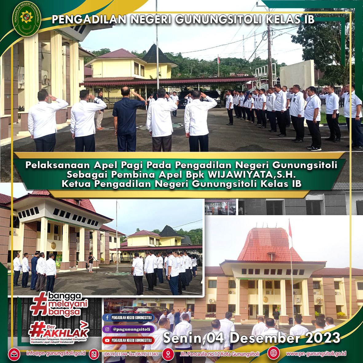 Humas, 4 Desember 2023. Pengadilan Negeri Gunungsitoli melaksanakan apel senin pagi pada tanggal 4 Desember 2023. Apel dipimpin oleh Ketua Pengadilan Negeri Gunungsitoli, Bapak Wijawiyaa, S.H., dan dihadiri oleh seluruh pegawai Pengadilan Negeri Gunungsitoli.