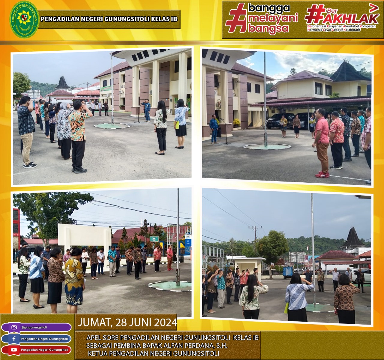(Humas-PNGSt). 28 Juni 2024. Pengadilan Negeri Gunungsitoli melaksanakan Apel Sore yang dipimpin oleh Hakim Pengadilan Negeri Gunungsitoli, Bapak Alfan Perdana, S.H., dan dihadiri oleh seluruh pegawai Pengadilan Negeri Gunungsitoli.