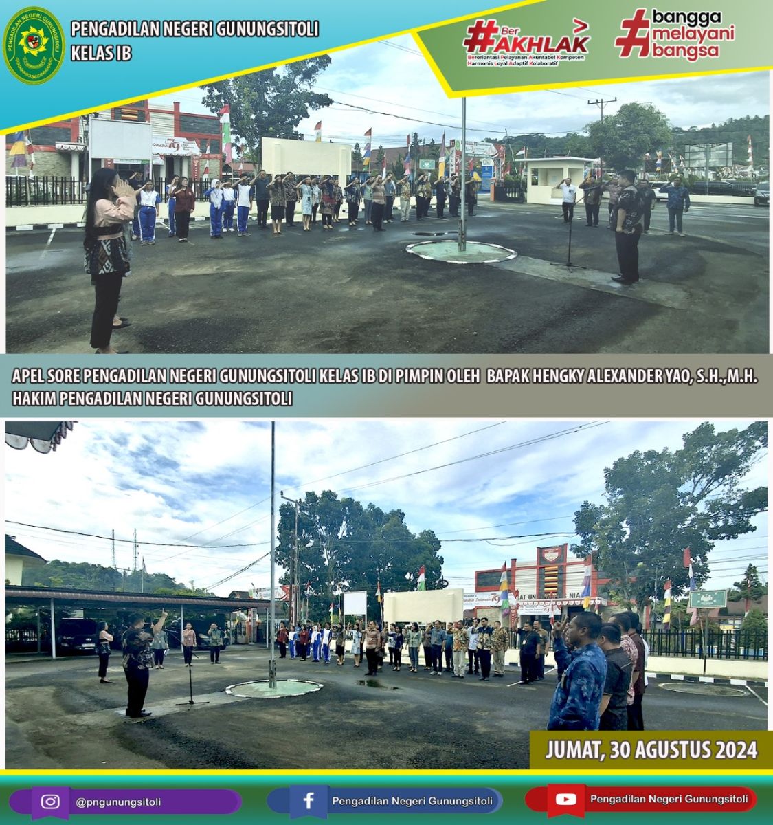 (Humas-PNGSt). 30 Agustus 2024. Pengadilan Negeri Gunungsitoli melaksanakan Apel Sore yang dipimpin oleh Hakim Pengadilan Negeri Gunungsitoli, Bapak Hengky Yao, S.H.,M,H., dan dihadiri oleh seluruh pegawai Pengadilan Negeri Gunungsitoli.