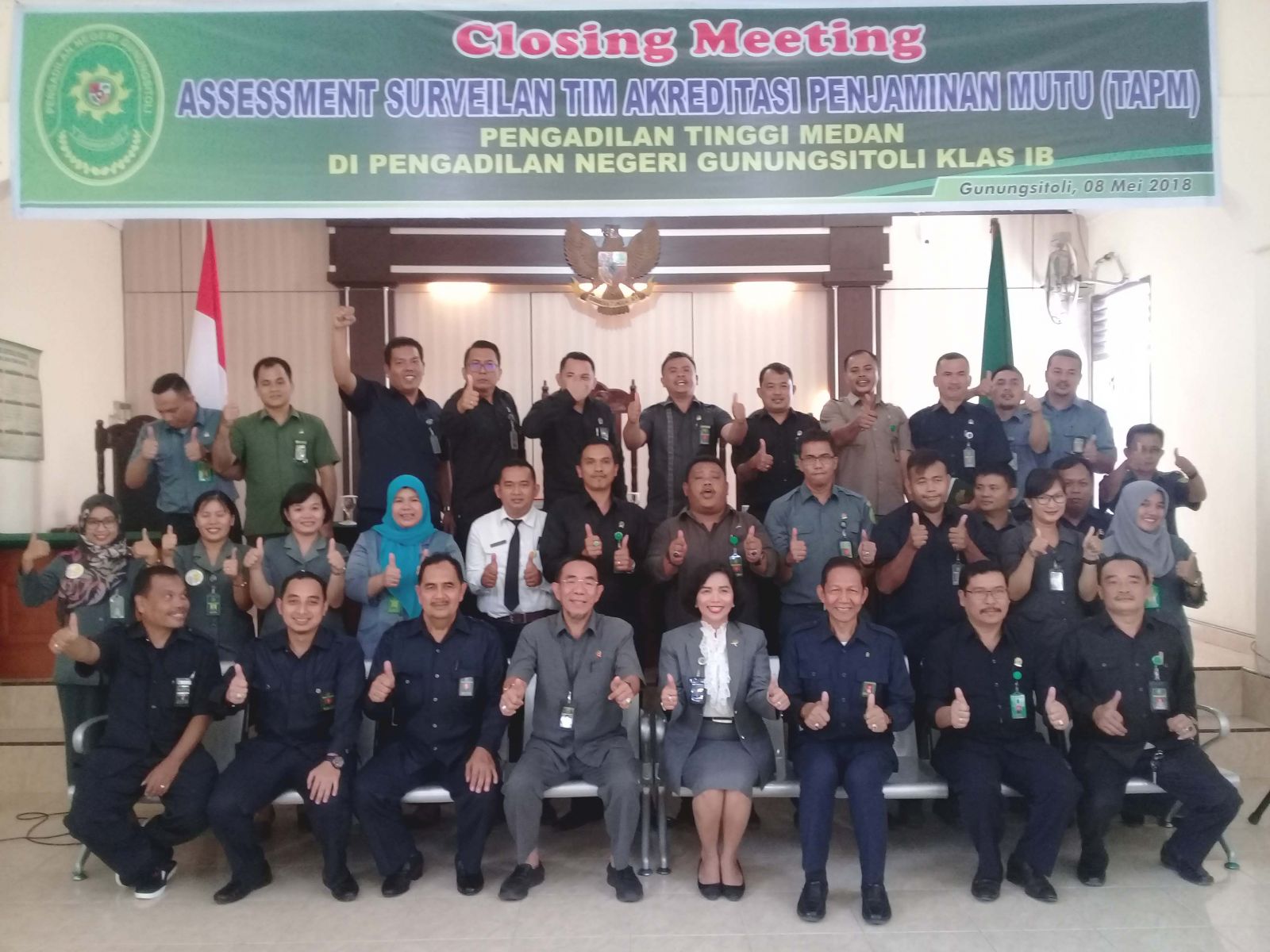 (Selasa, 08 Mei 2018) Tim Akreditasi Penjaminan Mutu (TAPM) Pengadilan Tinggi Medan mengadakan closing meeting di Ruang Sidang Cakra Pengadilan Negeri Gunungsitoli. Acara dimulai pada pukul 11.00 WIB yang diawali dengan menyanyikan lagu "Bagimu Negeri" dilanjutkan dengan yel-yel akreditasi penjaminan mutu kemudian sambutan Ketua Pengadilan Negeri Gunungsitoli Ibu Mery Donna Tiur Pasaribu, S.H.,M.H.dan sambutan Lead Assesor Bapak Daliun S.H.,M.H.