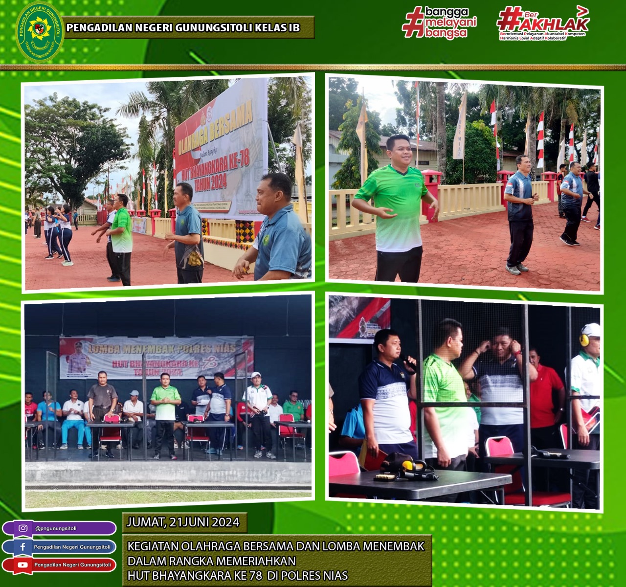 (Humas-PNGSt). Jumat, 21 Juni 2024. Keluarga Besar Pengadilan Negeri Gunungsitoli menghadiri Kegiatan Olah Raga Bersama dan Lomba Menembak dalam rangka Memeriahkan HUT BHAYANGKARA ke-78 di Polres Nias berdasarkan undangan Kapolres Nias Nomor B/Und- 92 /VI/HUM.1.3./2024 tanggal 20 Juni 2024.