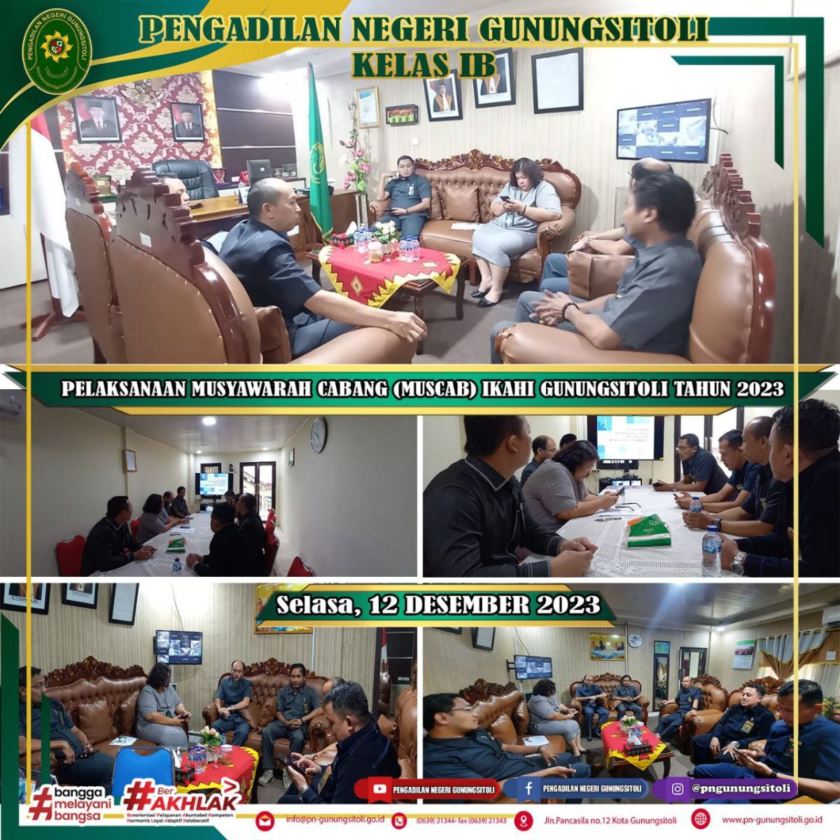 Pada hari Selasa, 12 Desember 2023 Pukul 10.00 WIB bertempat di Ruangan Media Center Pengadilan Negeri Gunungsitoli dilaksanakan Acara Musyawarah Cabang Ikatan Hakim Indonesia (IKAHI) Cabang Gunungsitoli tahun 2023, yang di hadiri oleh Ketua Pengadilan Negeri Gunungsitoli, Ketua Pengadilan Agama Gunungsitoli, Para Hakim Pengadilan Negeri Gunungsitoli, Para Hakim Pengadilan Agama Gunungsitoli.