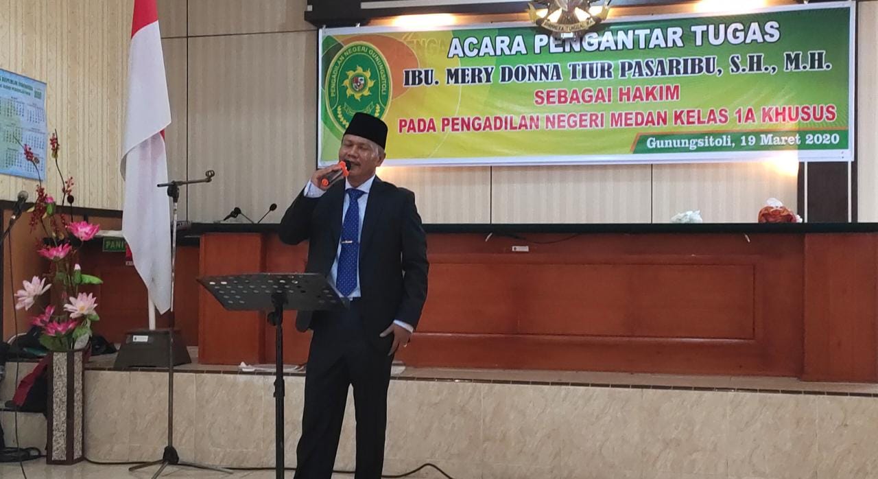 Pelantikan di pimpin langsung oleh Ketua Pengadilan Negeri Gunungsitoli, Ibu Mery Donna Tiur Pasaribu, S.H,M.H. Dalam acara sekaligus dilaksanakan kegiatan Pengantar Alih Tugas Ibu Mery Donna Tiur Pasaribu, S.H,M.H sebagai Hakim di Pengadilan Negeri Kelas I A. Acara berlangsung dengan khidmat dan lancar tanpa adanya hambatan berarti. Dalam kata sambutan pelantikan, Ketua Pengadilan Negeri Gunungsitoli berpesan bahwa estafet kepemimpinan Pengadilan Negeri Gunungsitoli telah diserahkan kepada Wakil Ketua Pengadilan Negeri Gunungsitoli, seluruh hal yang baik harus lah terus di jaga dan semakin di tingkatkan dalam pencapaian kinerja peradilan yang agung dan hal yang kurang baik agar terus dilakukan pembenahan kedepannya demi memberikan pelayanan terbaik kepada para pencari keadilan di Kepulauan Nias.