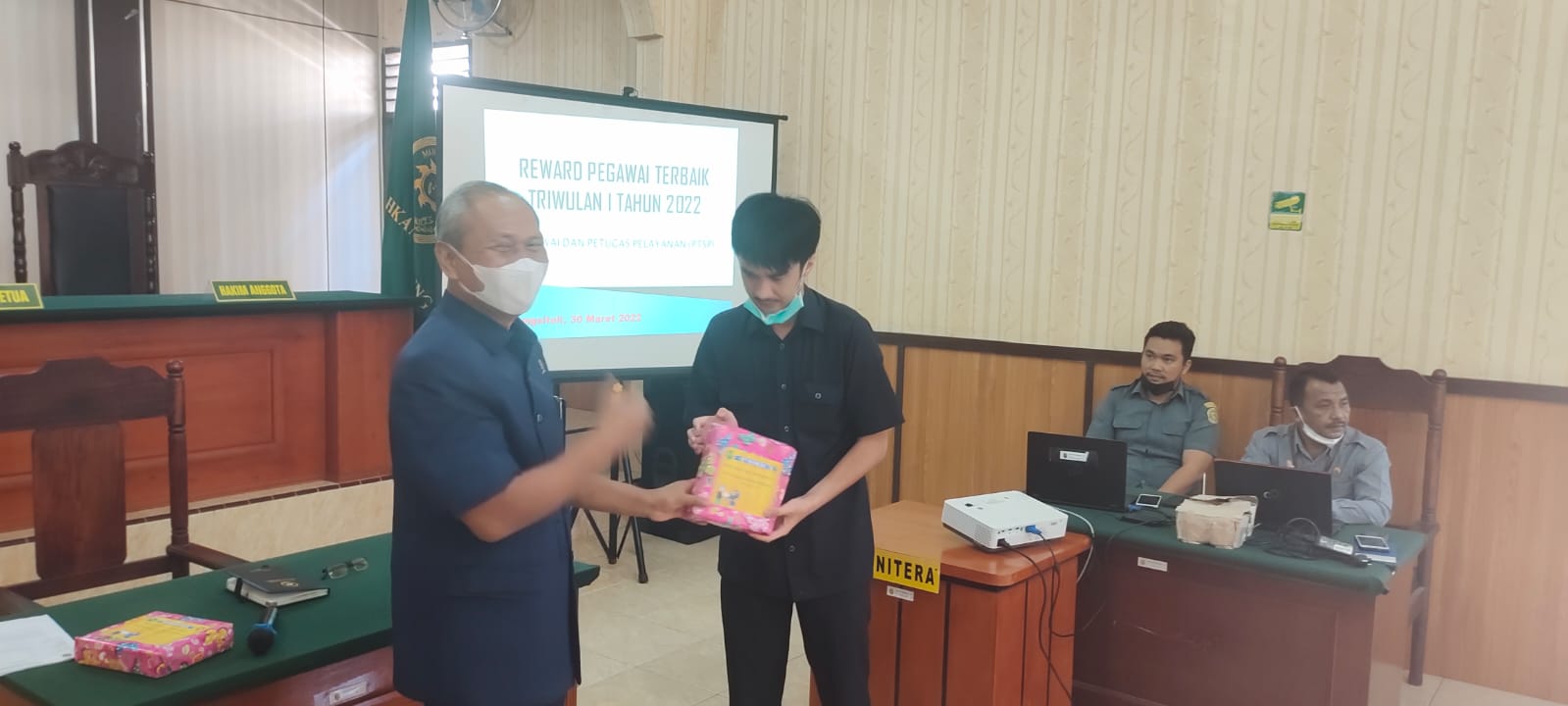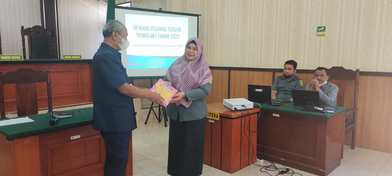 Humas, 31 Maret 2022. Sebagai bagian dari penghargaan terhadap kinerja aparatur yang bertugas di Pengadilan Negeri Gunungsitoli, maka pada tanggal 31 Maret 2022 dilaksanakan Pemberian Reward terhadap Pegawai dengan Kinerja paling baik periode Januari - Maret 2022. Adapun kategori pegawai yang diberikan reward ialah Pegawai Struktural/Fungsional dan Pegawai PTSP.