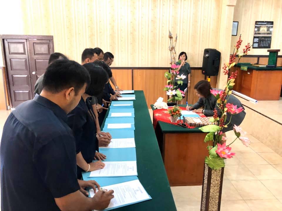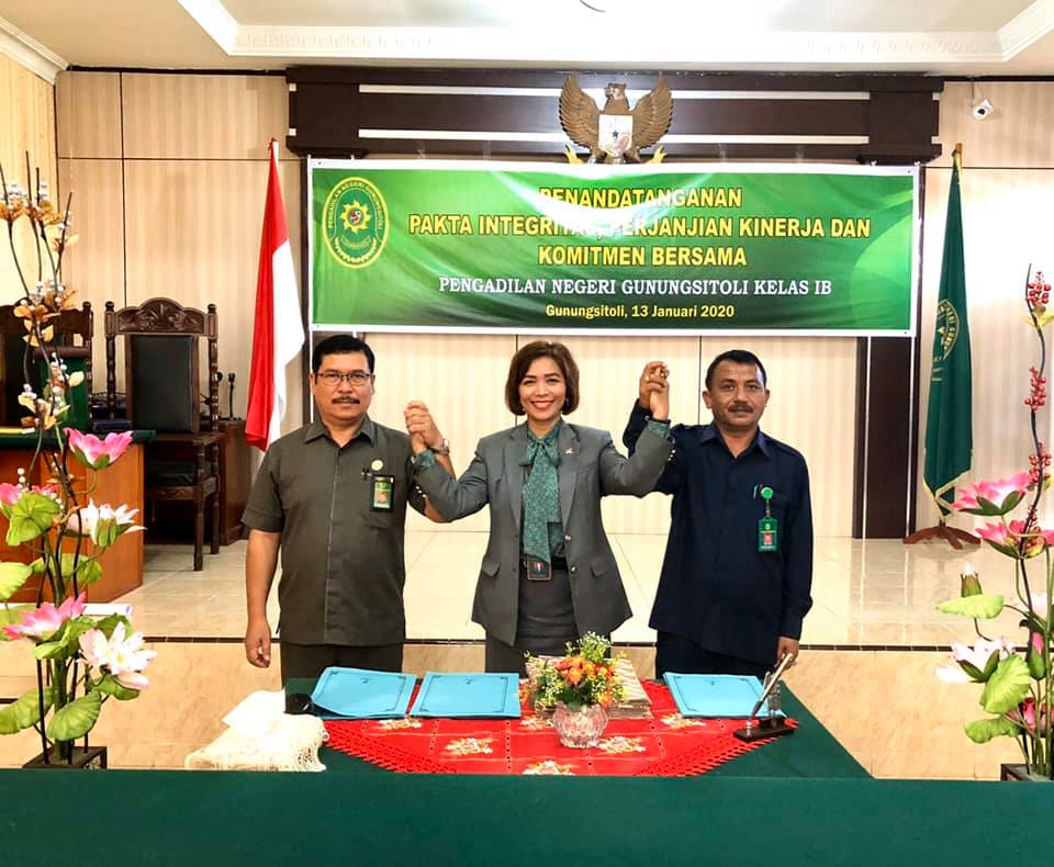 Humas, 14 Januari 2020. Keluarga Besar Pengadilan Negeri Gunungsitoli mengadakan kegiatan Penandatanganan Pakta Integritas, Perjanjian Kinerja dan Komitmen Bersama. Kegiatan ini rutin dilaksanakan setiap awal tahun dalam rangka komitmen bersama untuk mengciptakan lingkungan pekerjaan yang baik dan bersinergi. Di dalam kegiatan penandatanganan pakta integritas ini hadir Ketua Pengadilan Negeri Gunungsitoli Ibu Mery Donna Tiur Pasaribu, S.H.,M.H sebagai pemimpin kegiatan.