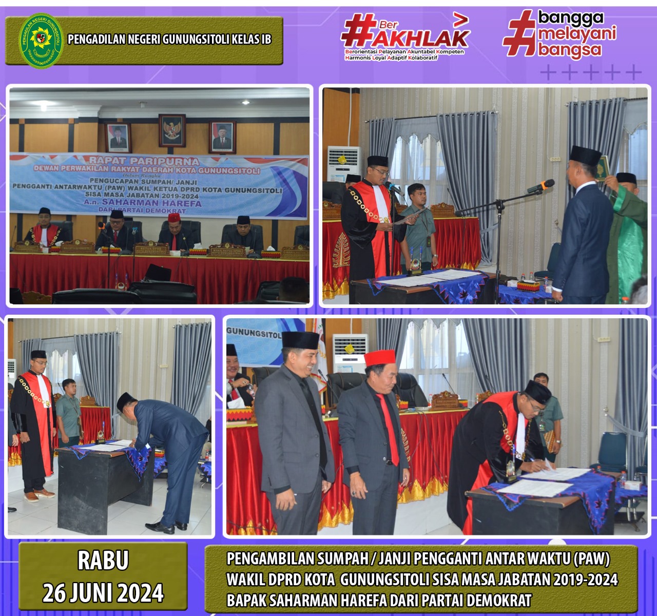 Bertempat di gedung Dewan Perwakilan Rakyat Daerah (DPRD) Kota Gunungsitoli. Ketua Pengadilan Negeri Gunungsitoli Bapak Wijawiyata, S.H., melantik Bapak Saharman Harefa, sebagai pengganti antar waktu Wakil Dewan Perwakilan Rakyat Daerah (DPRD) Kota Gunungsitoli. Acara tersebut dihadiri oleh Forkopimda Kota Gunungsitoli.