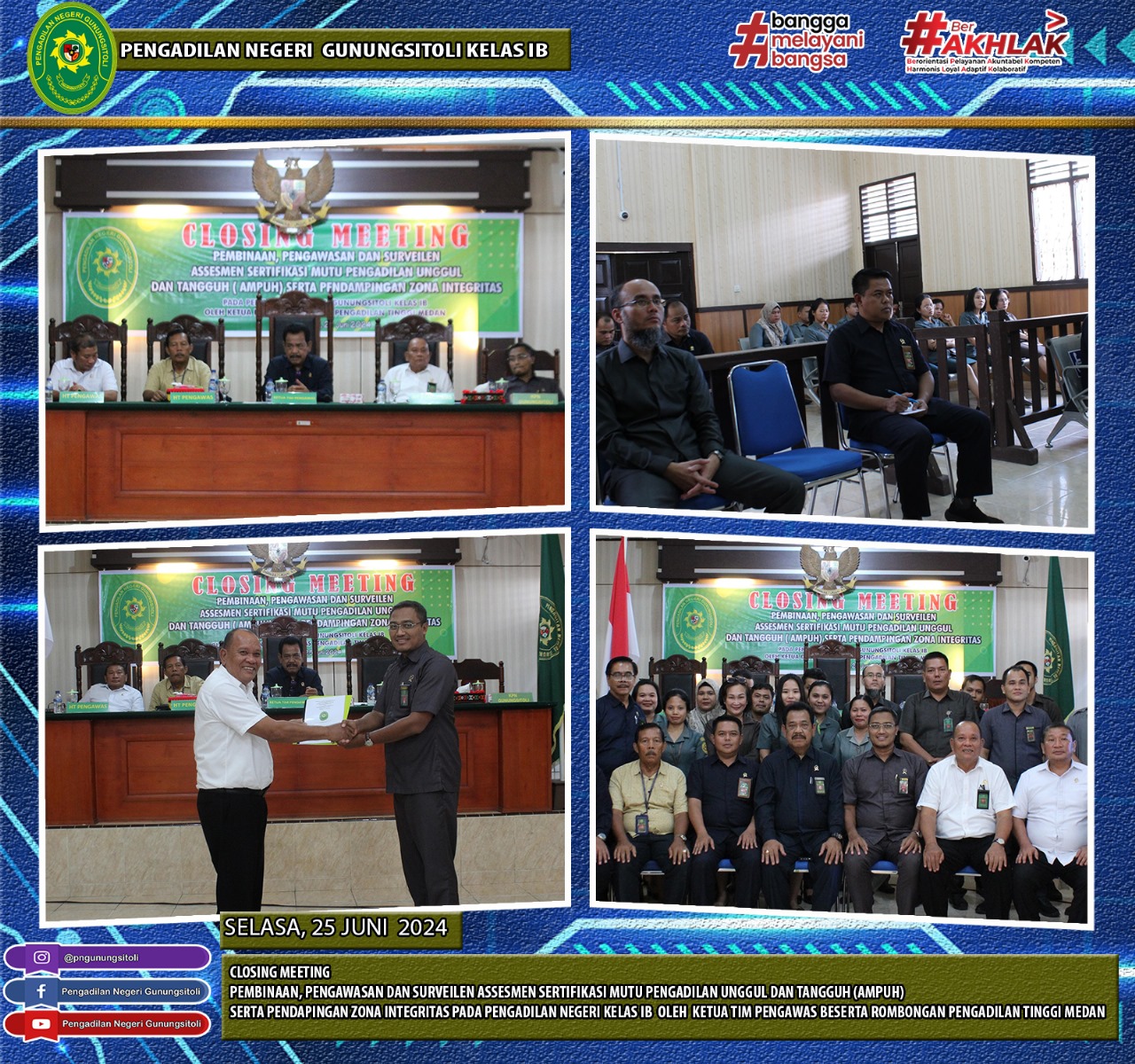 Gunungsitoli, 25 Juni 2024, Pengawasan pada Pengadilan Negeri Gunungsitoli oleh tim pengawasan dari Pengadilan Tinggi Medan telah selesai. Kegiatan penutupan pengawasan dilaksanakan dengan penyerahan laporan hasil pengawasan oleh Lead Asesor kepada Wakil Ketua Pengadilan Negeri Gunungsitoli. Kegiatan penutupan ini turut dihadiri oleh seluruh keluarga besar Pengadilan Negeri Gunungsitoli. Kegiatan Pengawasan berjalan dengan lancar, mulai dari kegiatan pembukaa, pengawasan, hingga penutupan. Hal ini berkat kerjasama yang baik dari Pengadilan Negeri Gunungsitoli.