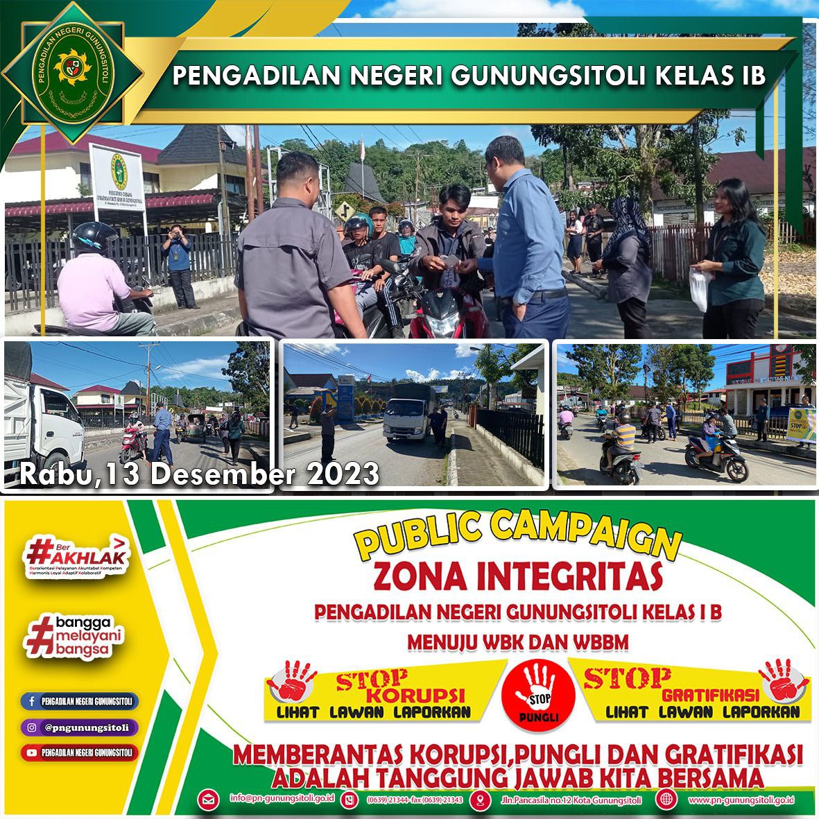 Gunungsitoli - Rabu (13/12/2023) Dalam rangka mewujudkan program Mahkamah Agung RI yaitu pembangunan Zona Integritas menuju Wilayah Bebas Korupsi (WBK) pada badan peradilan di bawahnya. Pengadilan NegeriGunungsitoli pada Rabu tanggal 13 Desember 2023, menggelar kegiatan Public Campaign dengan cara pembagian stiker kepada masyarakat pengguna jalan. Kegiatan ini bertujuan mensosialisasikan dan menunjukkan komitmen kuat dari Pengadilan Negeri Gunungsitoli dalam melakukan pembangunan Zona Integritas menuju Wilayah Bebas Korupsi (WBK) serta mengajak seluruh Masyarakat untuk ikut mengawali dan mengawasi pembangunan Zona Integritas pada Pengadilan Negeri Gunungsitoli. Pada kegiatan tersebut Pimpinan dan seluruh keluarga besar Pengadilan Negeri Gunungsitoli ikut serta dalam pembagian Stiker kampanye Zona Integritas pada masyarakat pengguna jalan.