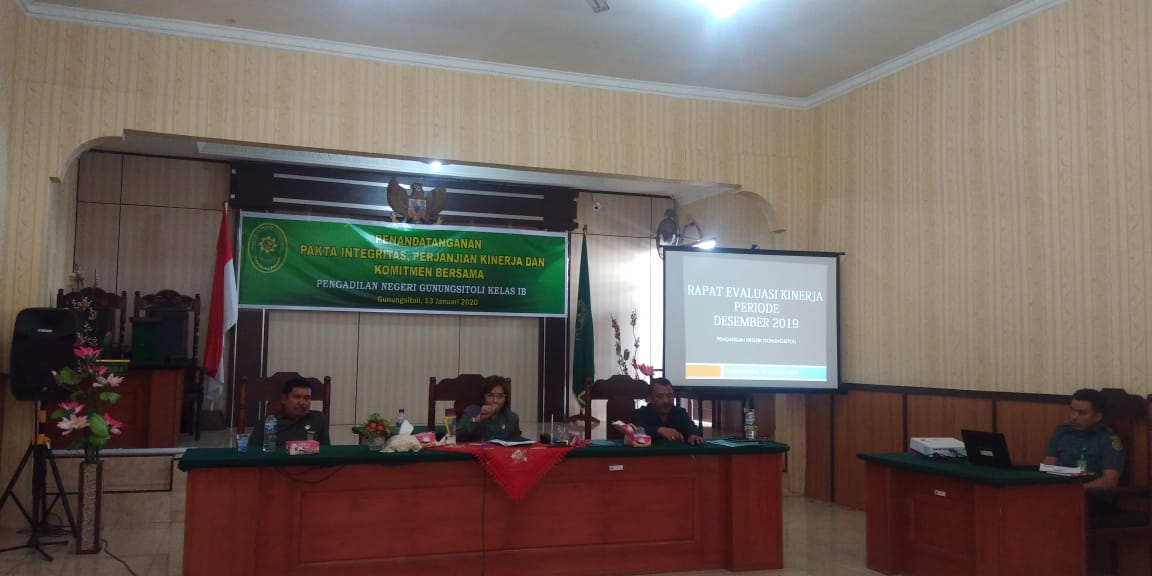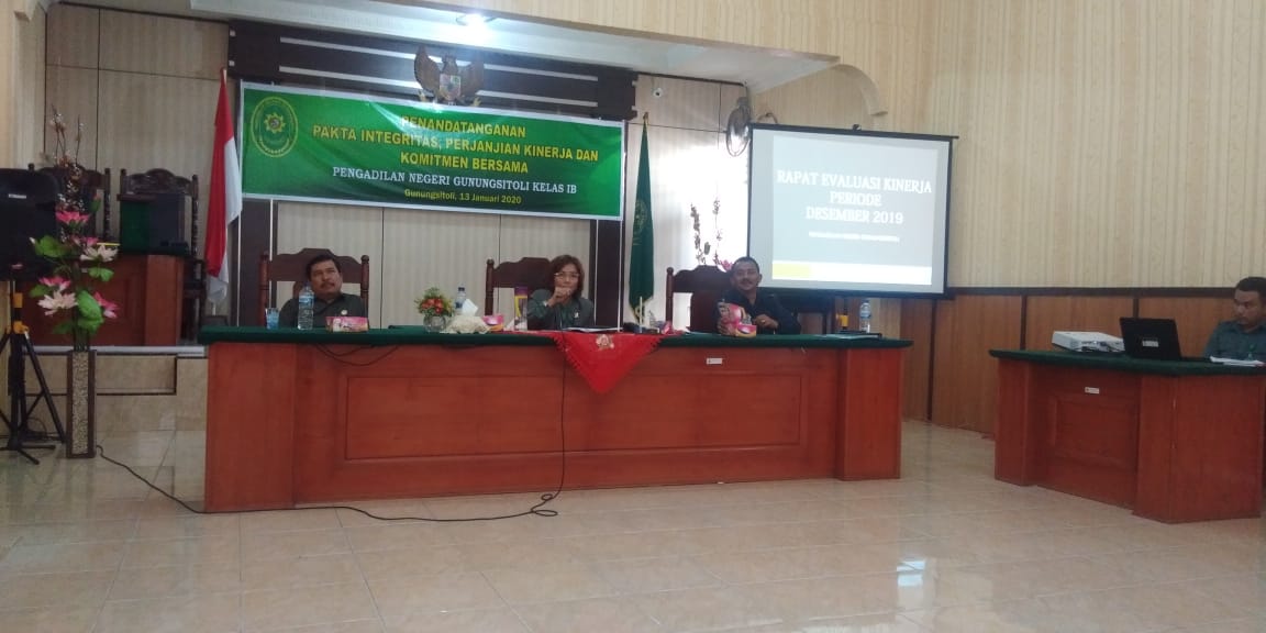 Humas, 14 Januari 2020. Bertempat di Ruang Sidang Cakra Pengadilan Negeri Gunungsitoli, Seluruh Keluarga Besar Aparatur Pengadilan Negeri Gunungsitoli melaksanakan kegiatan rutin Evaluasi Kinerja Bulan Desember 2019. Dalam rapat ini, hadir Ketua Pengadilan Negeri Gunungsitoli, Panitera dan Sekretaris sebagai pimpinan dalam rapat tersebut. Rapat kali ini membahas capaian kinerja di masing-masing bagian unit kerja untuk periode Desember 2019. Rapat juga diikuti oleh Hakim, Panitera Pengganti, Para Kepala Sub Bagian, Jurusita, Staff dan para honorer.