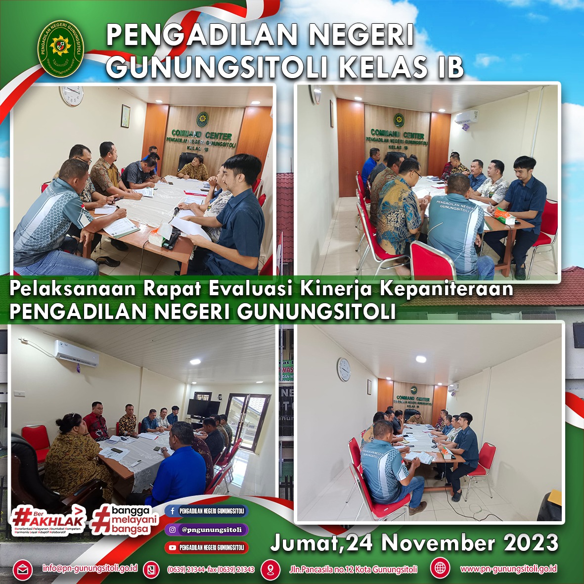 Jumat, 24 November 2023, pukul 10.00 WIB, bertempat diruang Media Centre Pengadilan Negeri Gunungsitoli telah dilaksanakan rapat evaluasi Kepaniteraan. Rapat ini dipimpin oleh Wakil Ketua Pengadilan Negeri Gunungsitoli, Ibu Gabe Dorris Mora Boru Saragih. S.H., M.H., didampingi Panitera Negeri Gunungsitol Bapak Daniel Kemit, S.H., yang dihadiri oleh Panitera Muda Perdata, Panitera Muda Pidana, Panitera Muda Hukum, dan Jurusita Pengganti. Rapat diawali dengan pemberian arahan dari Panitera Pengadilan Negeri Gunungsitoli Daniel Kemit, S.H