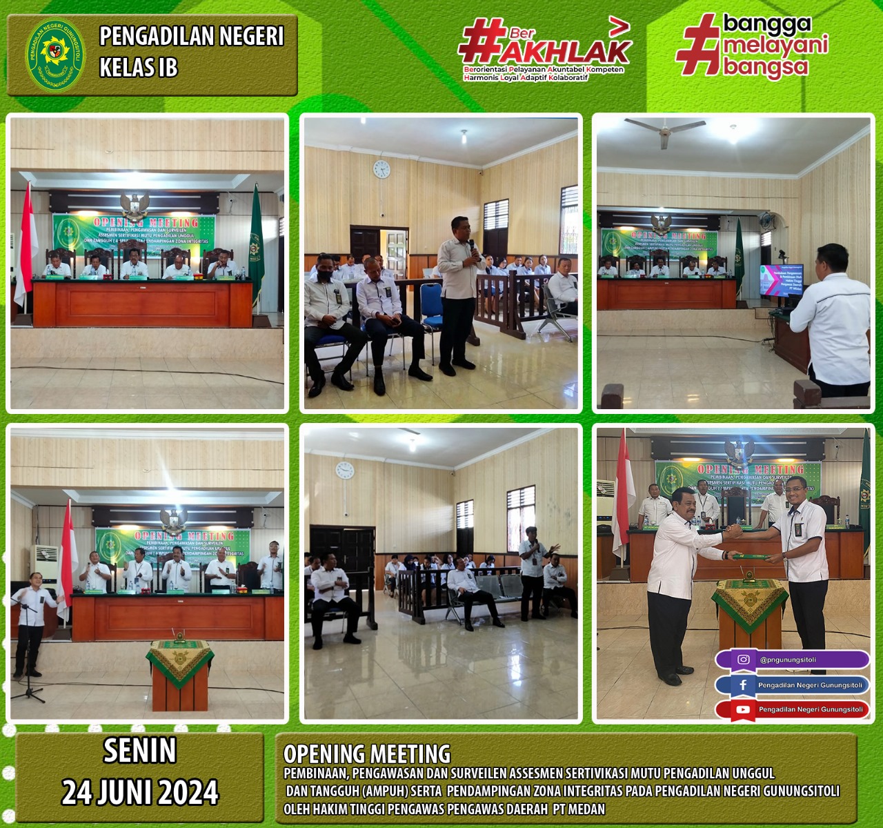 Acara dibuka dengan menyanyikan lagu Indonesia Raya dan dilanjutkan dengan menyanyikan lagu Hymne Mahkamah Agung RI yang mana diikuti oleh seluruh peserta. Dilanjutkan dengan mengucapkan 7 Nilai Utama Badan Peradilan Umum yang dipimpin oleh Wakil Ketua Pengadilan Negeri Gunungsitoli Bapak Dody Rahmanto, SH., MH. Dalam acara juga dilaksanakan penandatanganan antara Hakim Tinggi (Asesor) Bapak Belman Tambunan, S.H., M.H dengan Ketua Pengadilan Negeri Gunungsitoli Kelas IB Bapak Wijawiyata, SH.