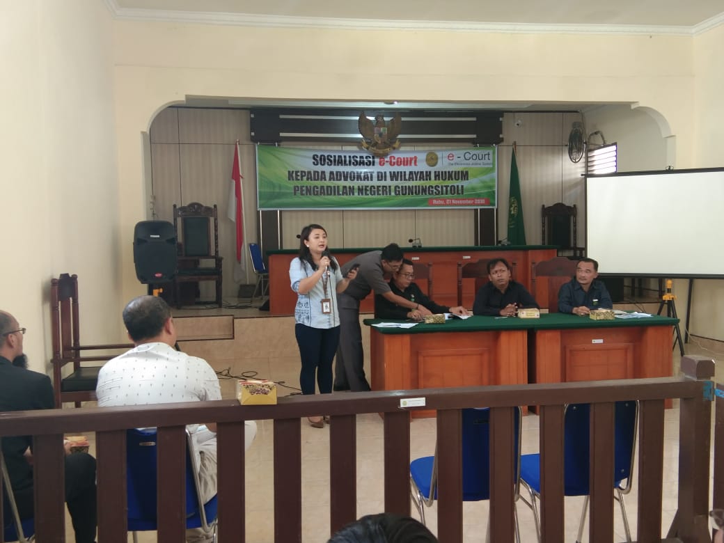 (Rabu, 21 November 2018). Pengadilan Negeri Gunungsitoli mengadakan Sosialisasi e-Court di Ruang Sidang Cakra Pengadilan Negeri Gunungsitoli. Sosialisasi dimulai pada pukul 15.00 WIB yang dipimpin oleh Bapak Taufiq Noor Hayat, S.H. selaku Plh Ketua di Pengadilan Negeri Gunungsitoli.
