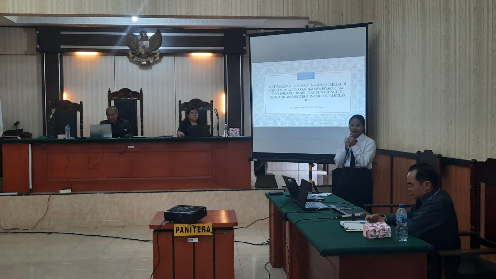 Dan yang terakhir saudari Ani Martatina Telaumbanua dengan judul aktualisasi "Optimalisasi Tata Tertib Sidang melalui Pembuatan Video menggunakan Bahasa Isyarat bagi Tunarungu yang Mengikuti Sidang pada Ruang Sidang Pengadilan Negeri Gunungsitoli.