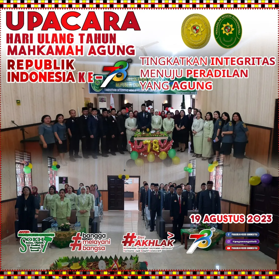 Sabtu, 19 Agustus 2023, bertempat dihalaman Kantor Pengadilan Negeri Gunungsitoli, Keluarga Besar Pengadilan Negeri Gunungsitoli dan Keluarga Besar Pengadilan Agama Gunungsitoli mengikuti Upacara dalam rangka Peringatan Hari Ulang Tahun Mahkamah Agung Republik Indonesia Ke-78. Upacara dipimpin oleh Ketua Pengadilan Negeri Gunungsitoli, Bapak Wijawiyata, S.H. Acara dilanjutkan dengan pemberian Satya Lencana kepada pegawai Mahkamah Agung yang telah mengabdi di Mahkamah Agung. Dan setelah Upacara selesai, acara dilanjutkan dengan pemotongan tumpeng HUT MARI Ke-78 di ruang sidang utama Pengadilan Negeri Gunungsitoli.