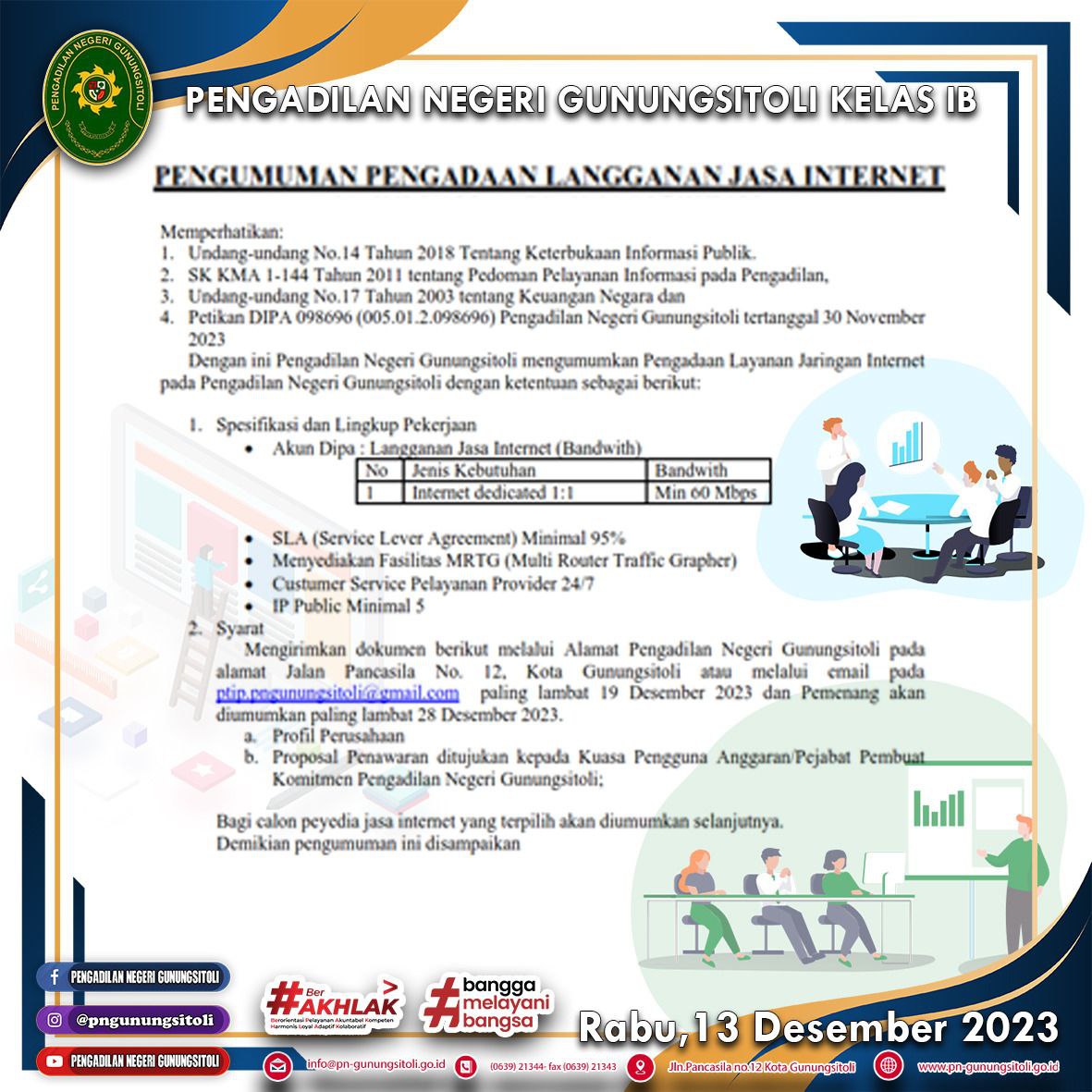 [PENGUMUMAN] Pengadilan Negeri Gunungsitoli mengumumkan Pengadaan Layanan Jaringan Internet pada Pengadilan Negeri Gunungsitoli dengan ketentuan sebagai berikut: