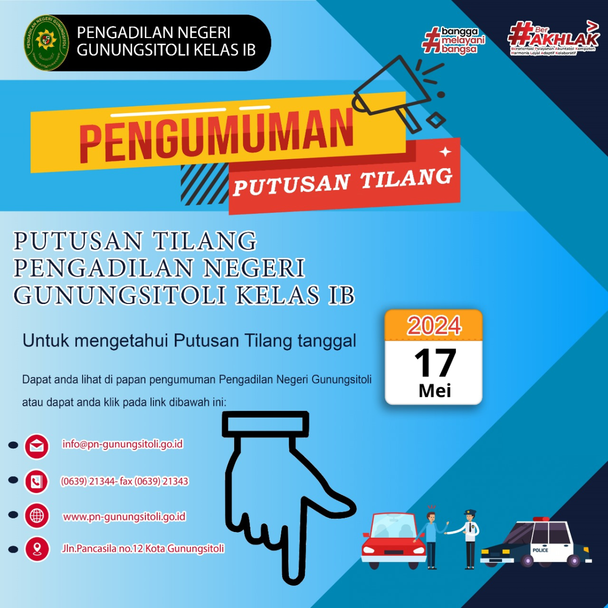 Untuk mengetahui pengumuman tilang tanggal 17 Mei 2024 dapat anda lihat di papan pengumuman Pengadilan Negeri Gunungsitoli atau dapat anda klik pada link dibawah ini: